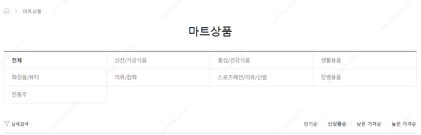 1. 마트 상품 : 신선/가공제품, 홍삼/건강식품, 생활용품, 화장품/뷰티, 의류/잡호, 스포츠패션/의류/신발, 장병용품,전통주