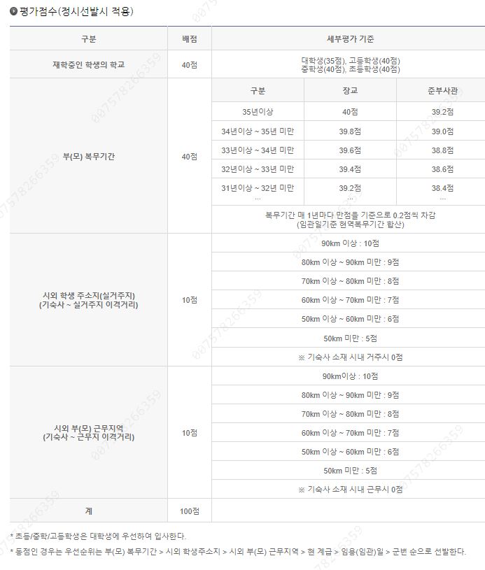 - 3순위: 공실 발생 시 현역군인의 재수생, 휴학생, 대학원생 자녀 가능