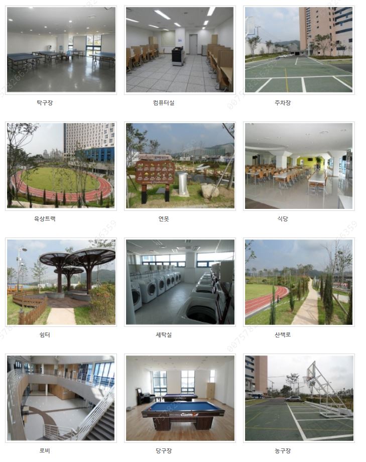 - 식당, 독서실, 헬스장, 탁구장, 당구장, 휴게실 (남,여), 세탁실, 잔디광장, 농구장, 족구장, 육상트랙, 산책로 등