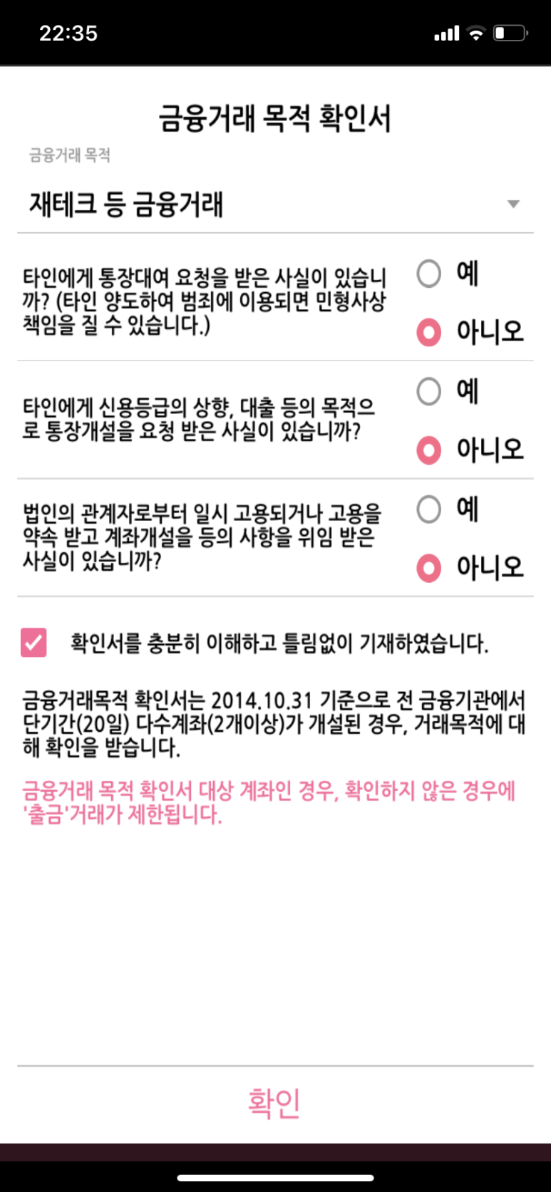 6) 본인 명의 계좌 정보, 금융거래 목적확인서는 모두 아니요, 집금거래 목적 아님