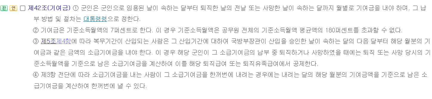기본적으로 군인연금을 받기 위해서 모든 군인은 기여금이라는 것을 낸다. 군인연금법에 보면 기여금은 기준소득월액의 7%라고 적혀있다. 매달 급여명세서를 보면 공제항목에 일반기여금 항목이 있다.