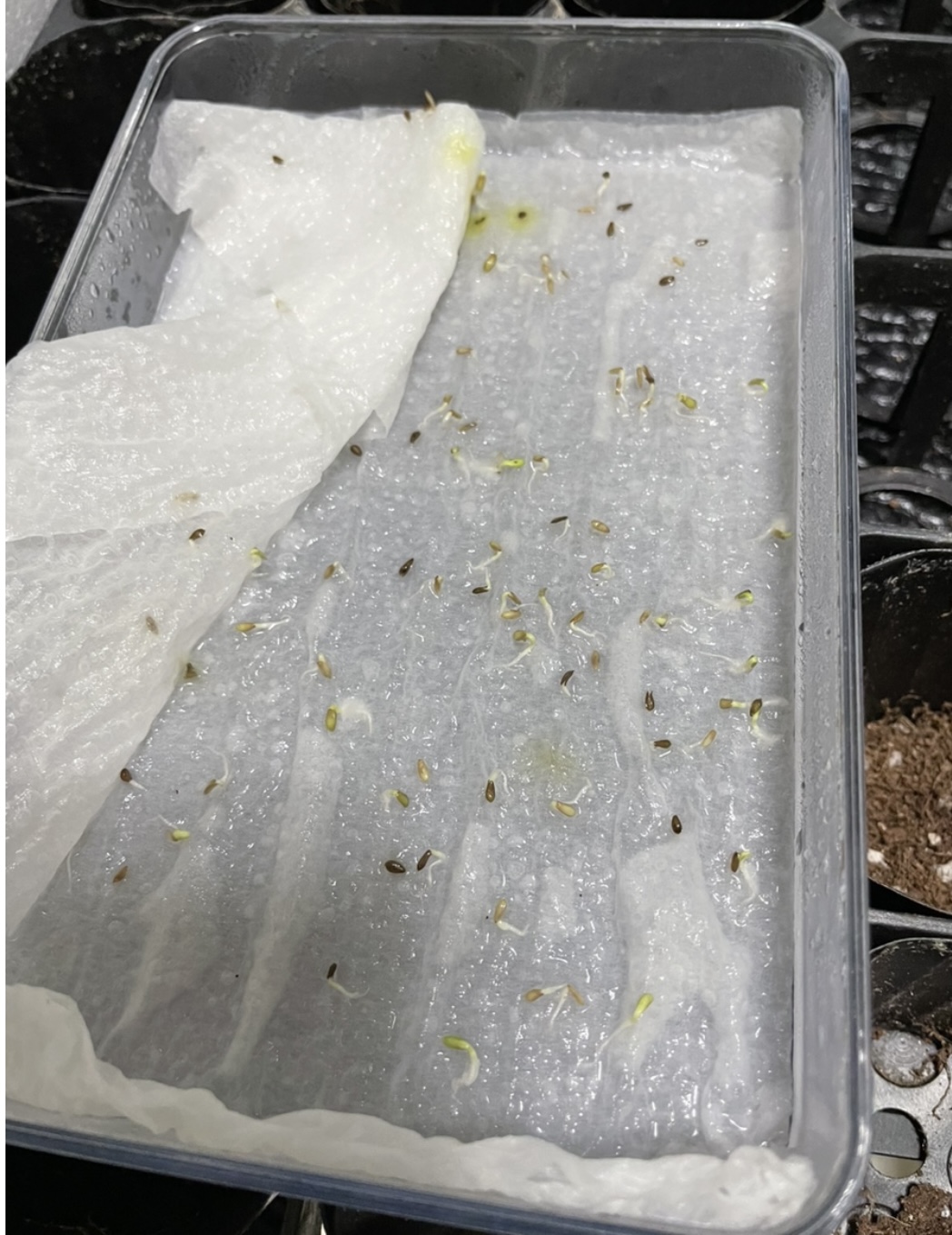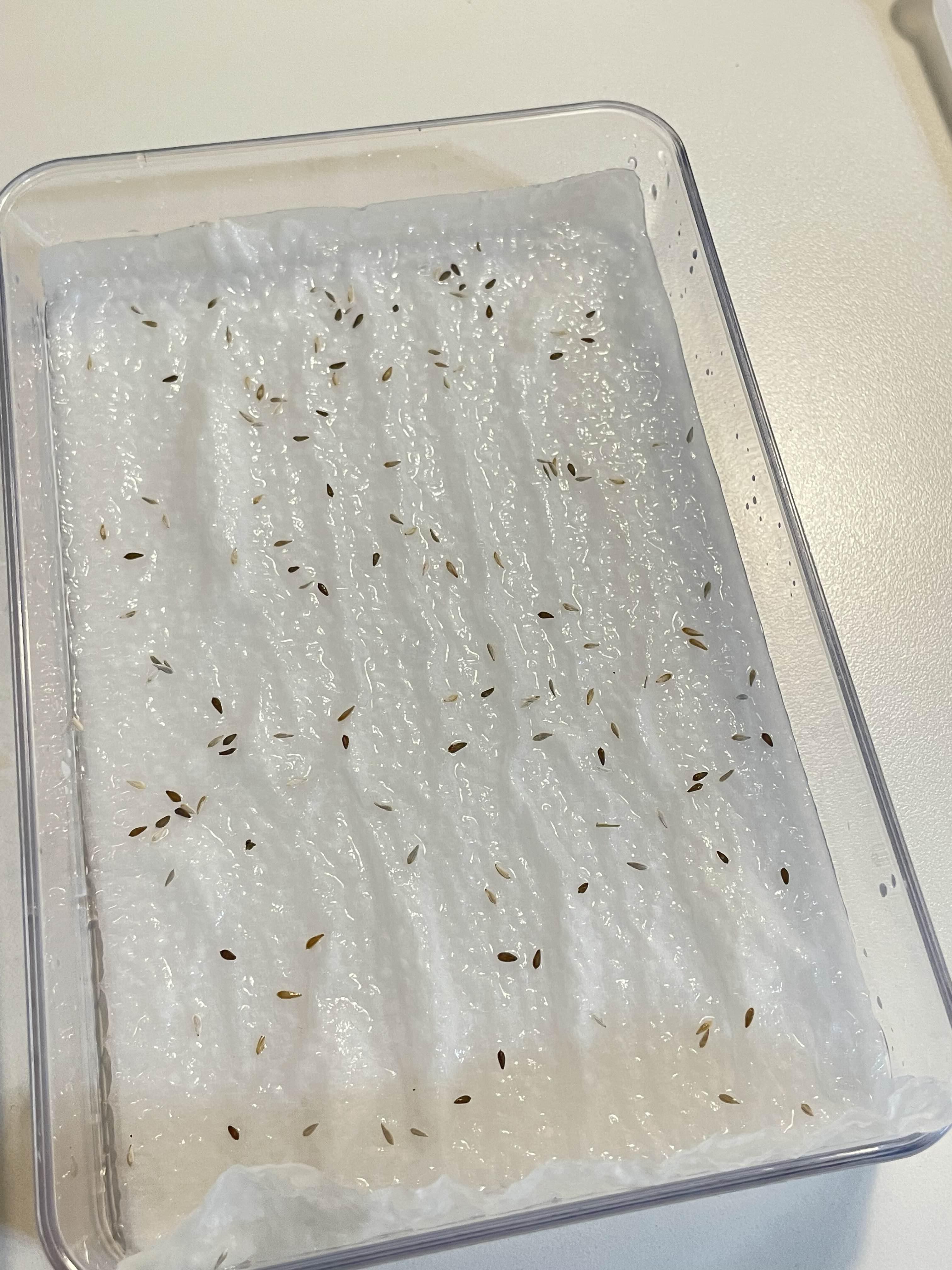 빈 통에 키친타올을 깔고, 물을 부어준 다음 상추 씨앗을 올려줍니다. 그런 다음 뚜껑을 덮어줘요. 밀폐되도 됩니다.