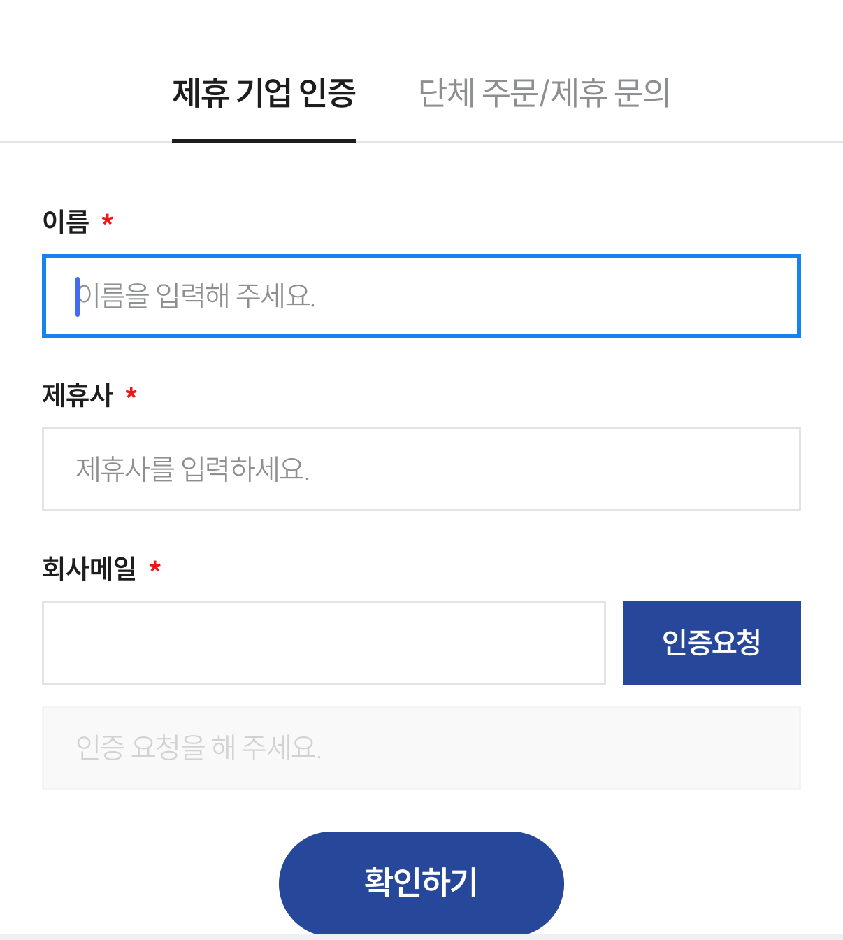그럼 이곳에 이름, 제휴사, 회사메일을 적어야하는데요.