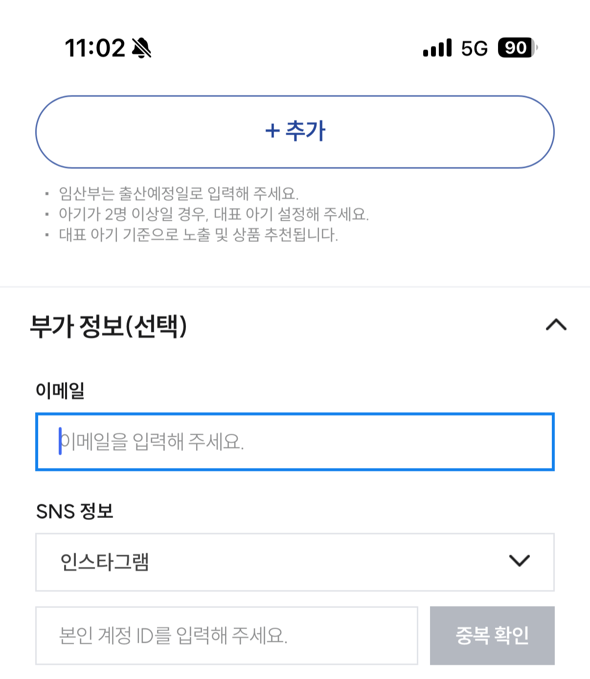 그리고 스크롤을 아래로 내리면 부가정보에 이메일 란이 있는데요. 이곳에 아까 만든 새로운 이메일 주소를 넣어줍니다.