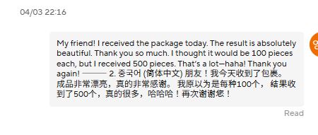 그런데 깜짝 놀랄 소식이 있었어요. 저는 100 피스씩만 주문했는데.... 이 친구가 무려 500 피스씩을 보내주었습니다...ㅋㅋㅋㅋㅋㅋ 주문하는 과정에서 내적 친밀감이 생겨서 그랬는지, 다른 사람들한테도 이렇게 많이 보내줬는지 모르겠어요. 너무 고마워서 또 감사의 인사를 남겼지요.